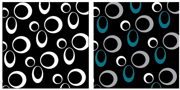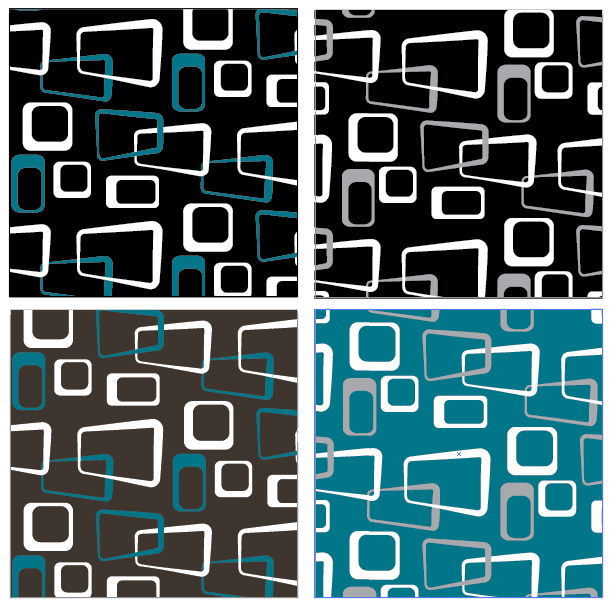 So when it came time to choose curtains and cushions, I decided I wanted to design an original pattern, in vector format (so I could re-size it up or down as necessary). This would then be sent to SpoonFlower to be made into fabric, which we would then sew into curtains, etc. The pattern needed to coordinate with the dark chocolate rugs and the dark teal accents already established in the living room. The architecture is very modern (more’s the pity) so 17th century velvet damask was out. Being fans of the Mad Men series, we agreed it should have an abstract 1950’s retro feel. Here’s what I came up with.
